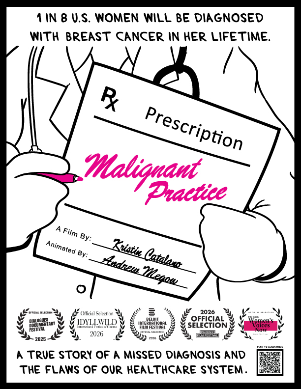 MALIGNANT PRACTICE is an animated short film based on the medical misfortune of a young woman whose breast cancer was missed by a doctor and a mammogram. This true story emphasizes the flaws within our healthcare system and the importance of being one’s own healthcare advocate.
